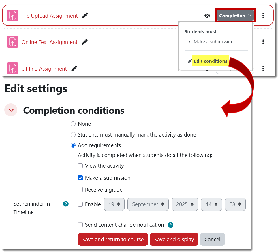 You can now update the completion requirements for an item without having to open it in edit mode. The Completion field includes a dropdown menu with a link to edit the conditions required for the item to be marked as complete. (Don’t forget that you can still edit completion requirements in bulk.)