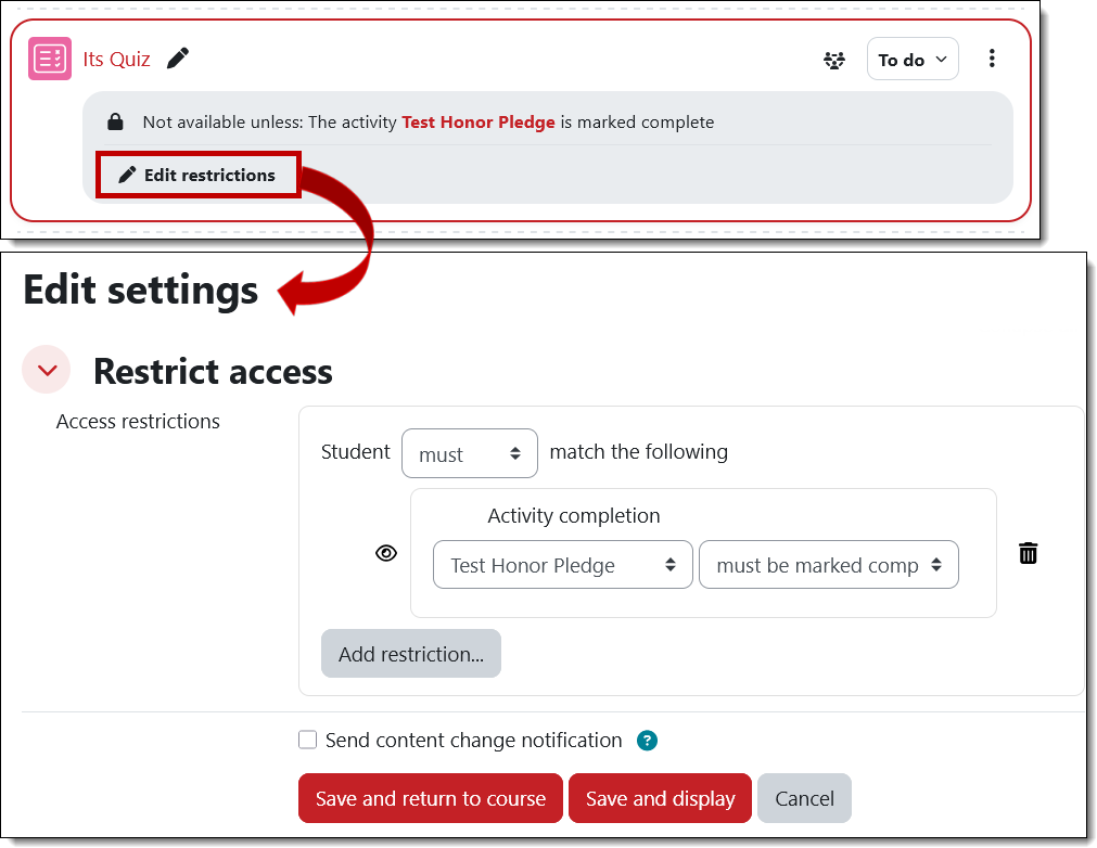 If you have placed access restrictions on an item, you can edit those settings by clicking on the Edit restrictions link. (Learn more about restricting access to course materials.)