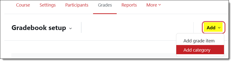 You’ll find a few changes in the Gradebook setup page. Instead of having buttons for adding an item or category at the top of the page, an extra click is required to reach those options (silly Moodle!).