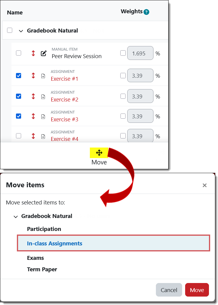 To move items into a category, check the box to the left of the item, then click on the Move icon at the bottom of the page. Here’s a quirky thing — if you select all the items in a category, the box for the category itself will also be checked! Go ahead and move the items, the category won’t move.