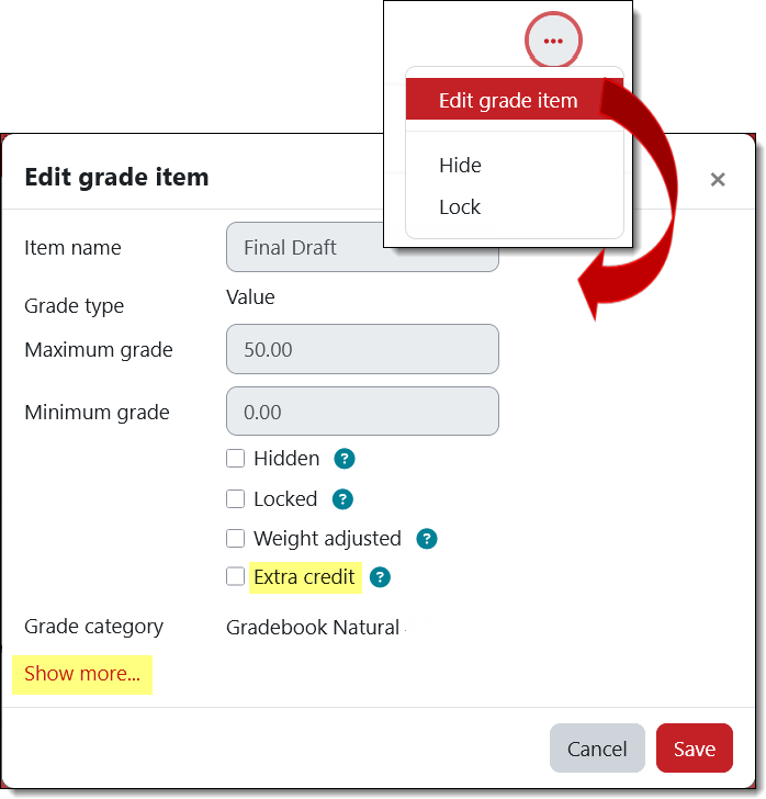 Click on the three dot “Cell actions” icon on the right to edit a grade item. (The item name and maximum grade for the assignment in this example can only be updated on the main course page where the assignment was created.) Check the box for Extra credit. (Learn more about extra credit.) The next page displays options from "Show more..."
