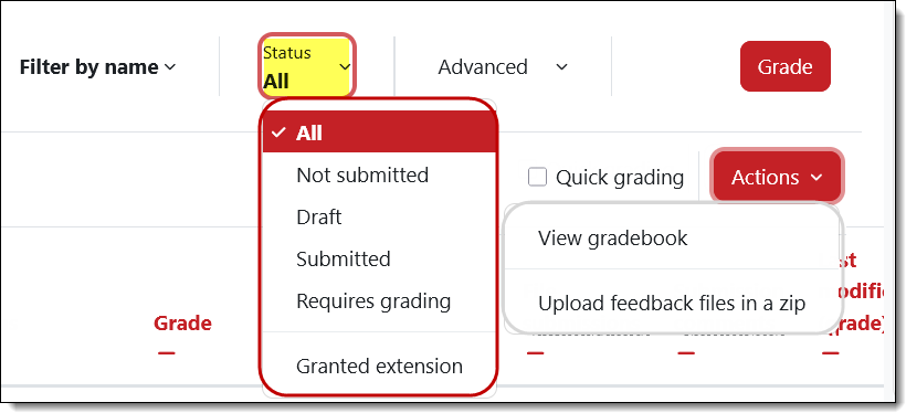 You can filter submissions based on their status, activate quick grading to enter scores in the current page, go to the gradebook or upload feedback files. (In prior versions, these links were located at the bottom of the page, so scrolling has been reduced in this case.)