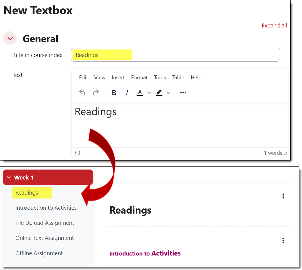 Textboxes now come with a “title” field which enables them to be included as navigational links in the course index in the left panel of your course. (Yay!)