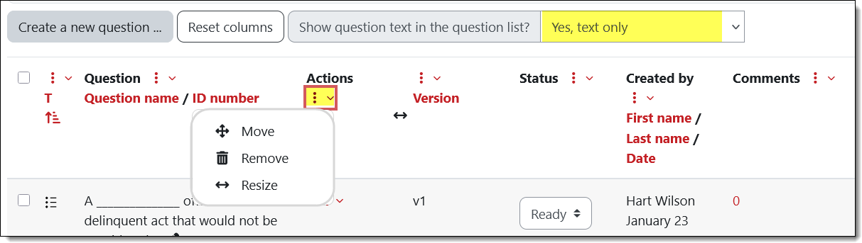 You can customize your view of questions in a question bank. Each column heading features a three-dot icon with options to move, delete or resize the column. Note that you can also choose to show the full text for each question in the list or reduce scrolling by leaving it out. See which mode works best for you in a given question list—some publisher test banks use numeric designations for question names instead of using the question text, so you'll likely want to keep the text only option activated to be able to distinguish between questions.
