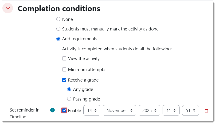 Completion settings include the opportunity to add a completion date to student timelines. (This option was previously labeled "Expect completion by...)